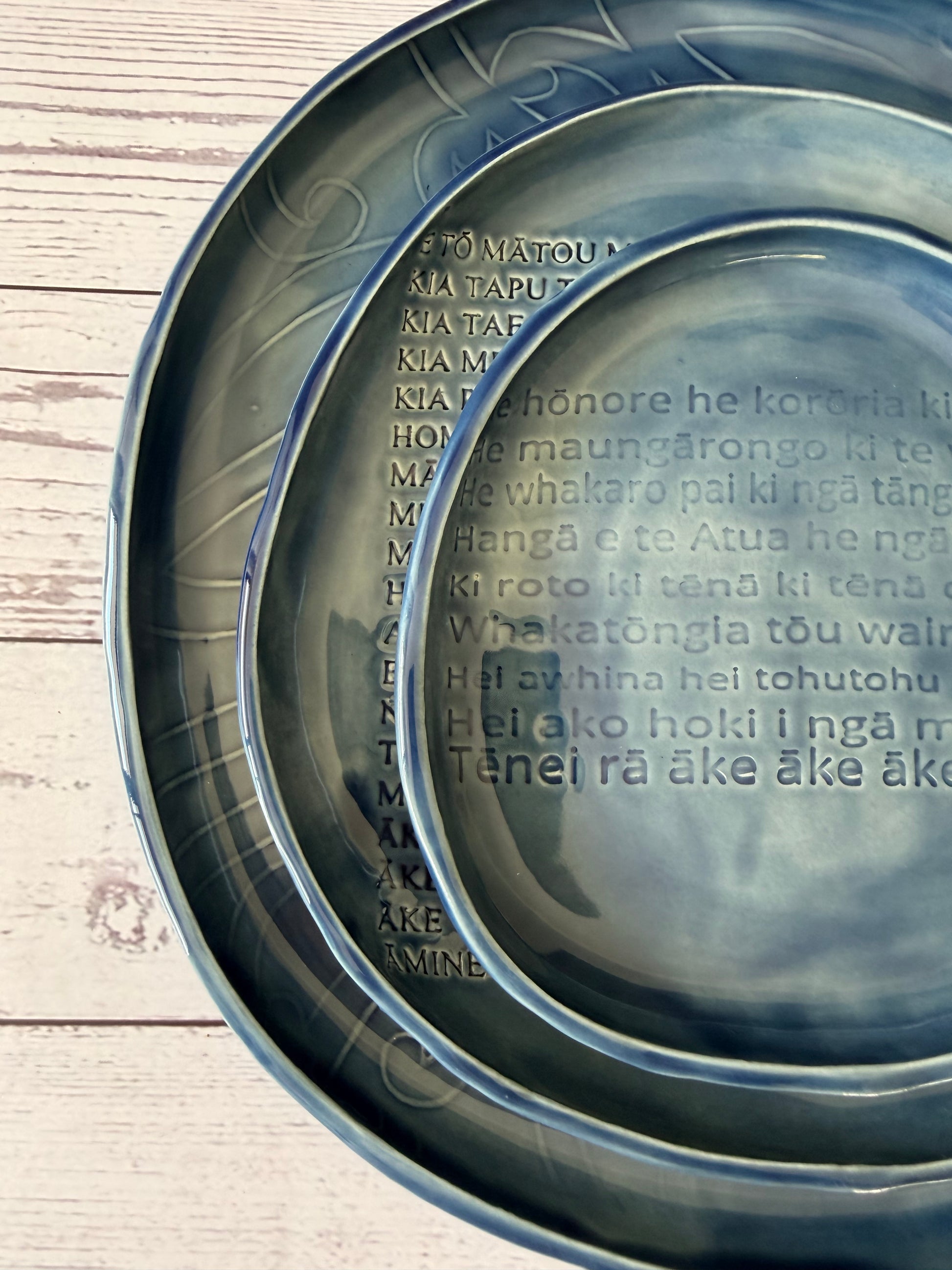 Beautifully presented, 3 different sized platters with karakia and Māori designs on them.