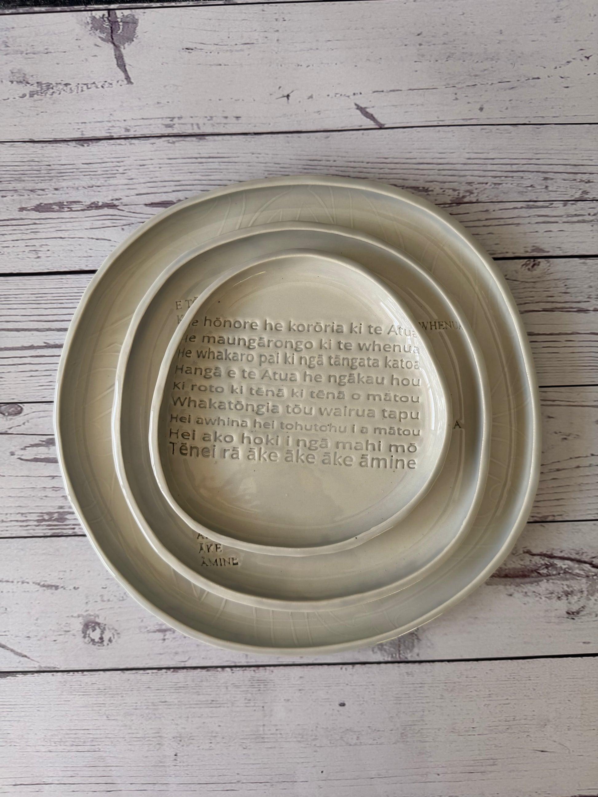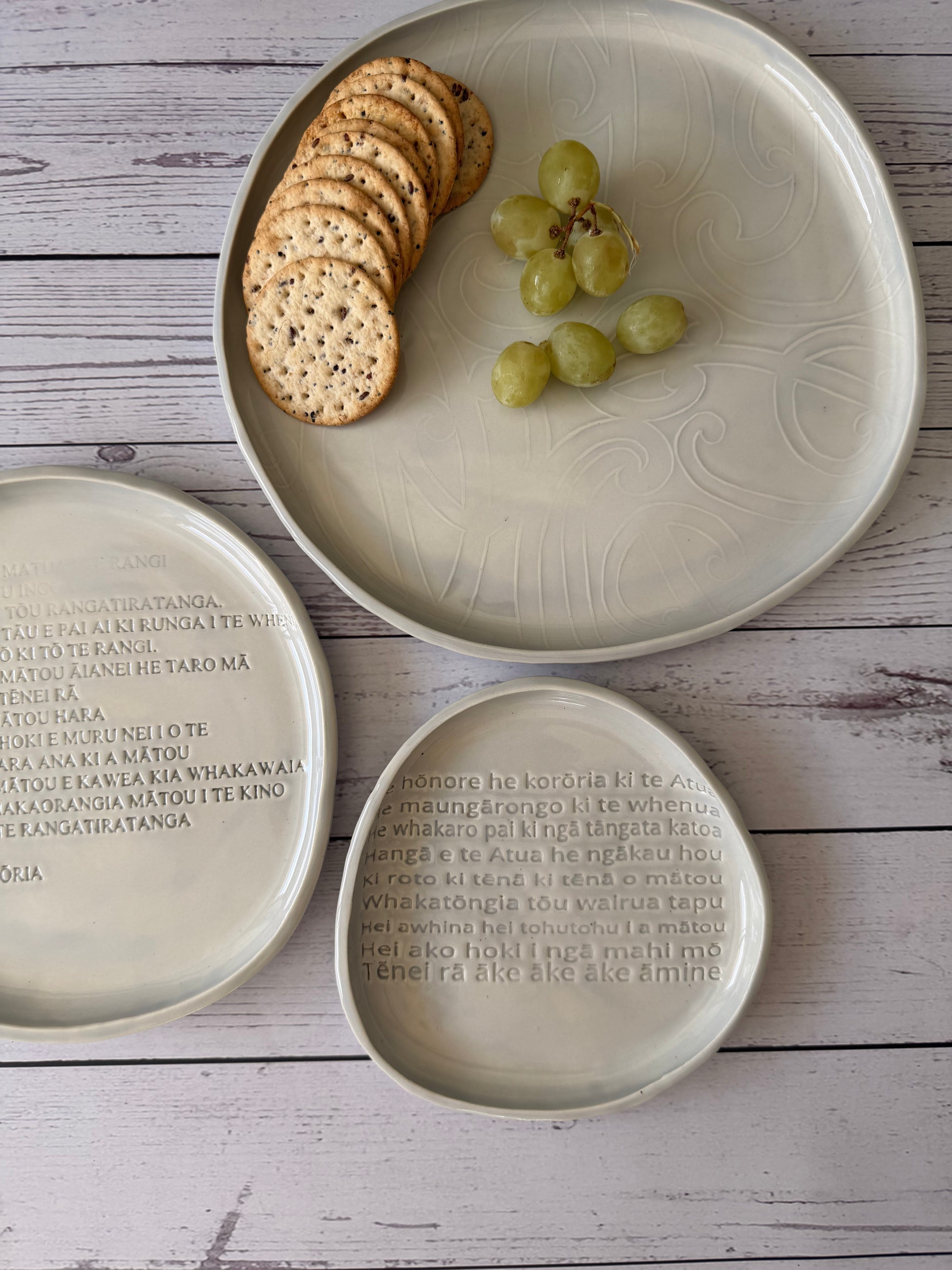 Beautifully presented, 3 different sized platters with karakia and Māori designs on them.