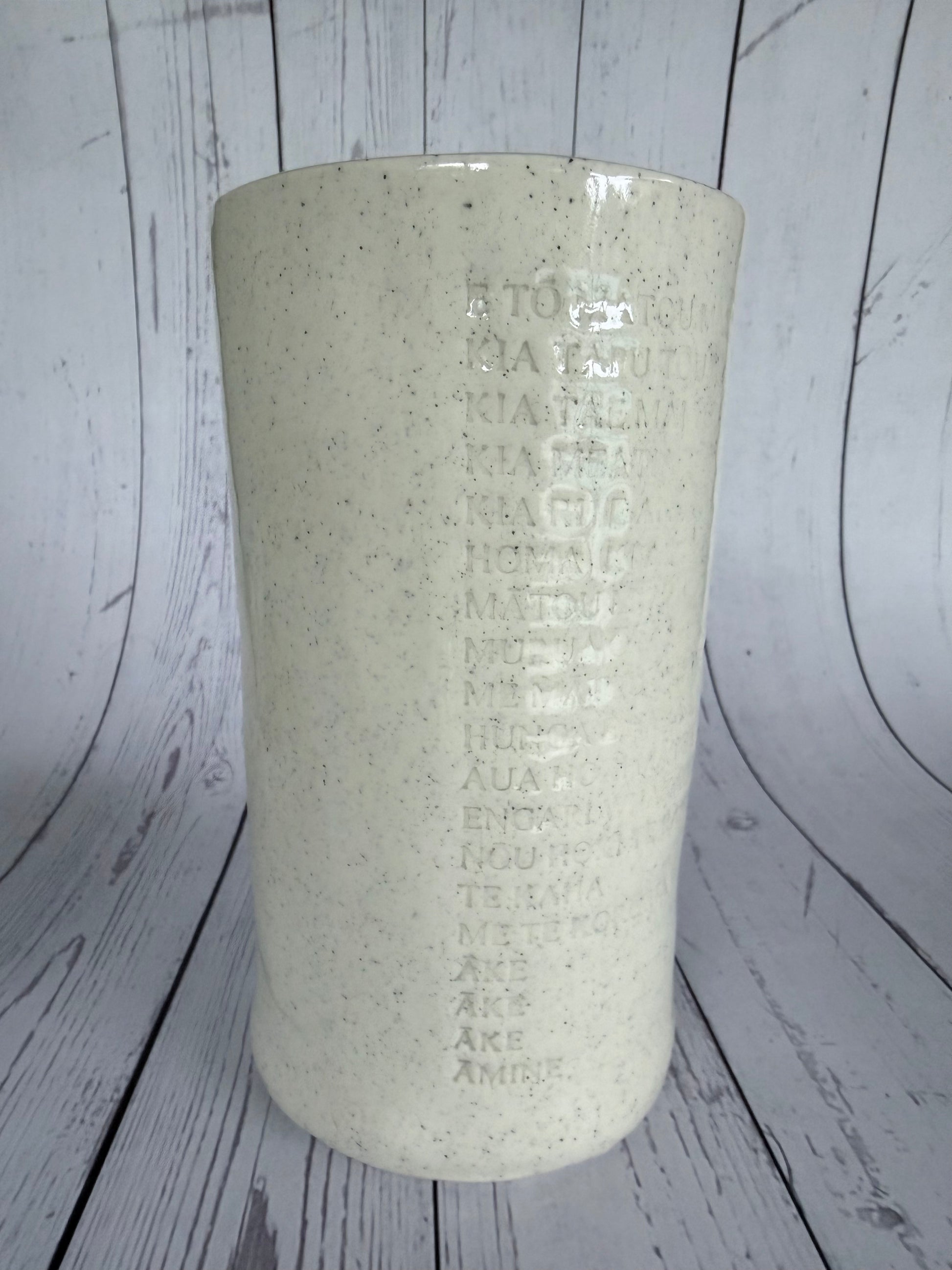 This vase has clear glaze over a karakia imprinted on the outside, with baby blue glazed inside.